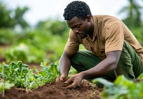 A african descent farmer carefully inspects the soil of a lush field, ensuring growth of healthy crops. concepts of agriculture, sustainability, and dedication in modern farming practices.