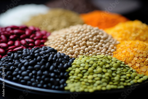 A artwork depicting a rustic wooden table with an assortment of legumes, including beans, peas, and lentils, arranged in an aesthetically pleasing composition in