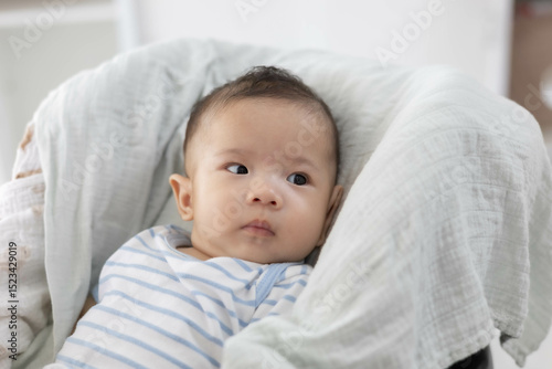 A baby is lying on a blanket with a striped shirt on. The baby has a serious expression on its face