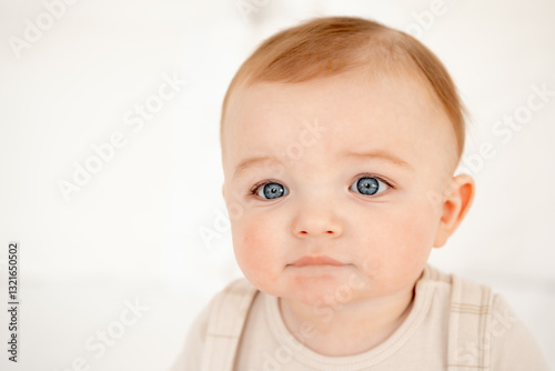 A baby on a white bed is smiling, a cute portrait of a small child a boy with blue eyes in beige clothes is sitting on a bed in a bedroom at home, a smiling baby