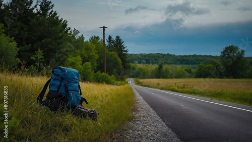 A backpack left on the side of a road, possibly forgotten or abandoned