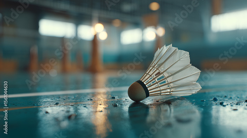 a badminton shuttlecock lying on the court, capturing the essence of sport and competition