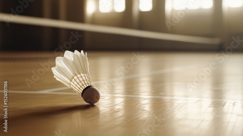 A badminton shuttlecock on a court with a focus on the shuttle and court markings, indoor setting with soft lighting, Elegant style