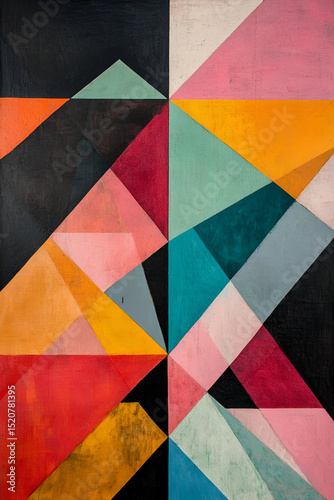 A balanced composition of interlocking triangles and squares in bold contrasting colors, arranged to create dynamic visual tension