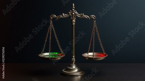 A balanced justice scale glowing in vibrant tones of red, green, and blue, presented on a sleek dark background for a modern look