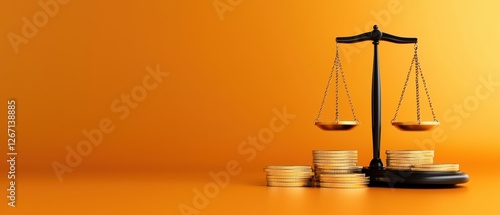 A balanced scale with coins symbolizing fairness and wealth on an orange background.