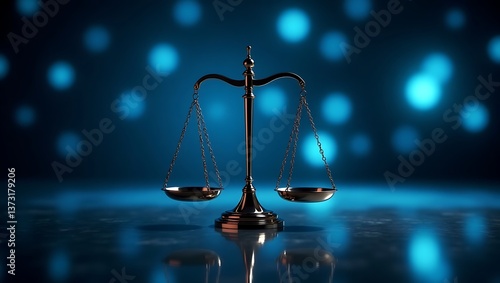 A balanced scales of justice against a dark blue background with bokeh lights and a reflective surface
