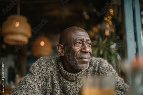 A bald, dark-skinned, elderly man talking passionately during an interview or conversation. A man is sitting at a table in a cozy and stylish restaurant.