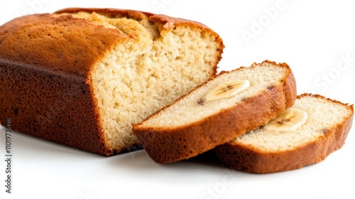 A banana bread loaf is partially sliced with visible banana pieces, capturing the essence of homemade baking with natural ingredients and a warm, inviting texture.