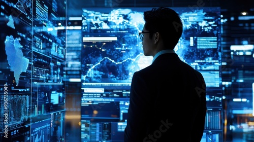 A bank employee demonstrating AI for fraud detection, with holographic visuals showcasing data analysis and suspicious transaction tracking.