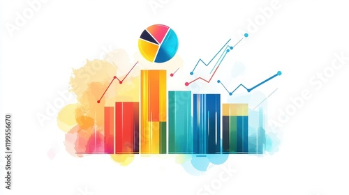 A bar chart with a pie chart overlay, hybrid data concept, abstract art style, bright tones, isolated on white background