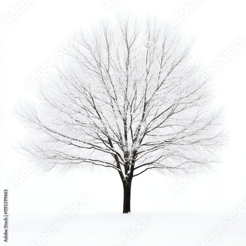 A barren tree stands alone in a snowy field, its leafless branches silhouetted against a serene winter landscape.