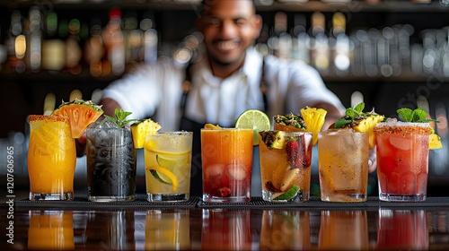 A bartender presents a colorful array of cocktails on a wooden tray in a lively bar setting.