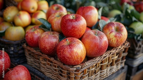 A basket filled with ripe, shiny apples displayed at a farmer's market, representing healthy eating