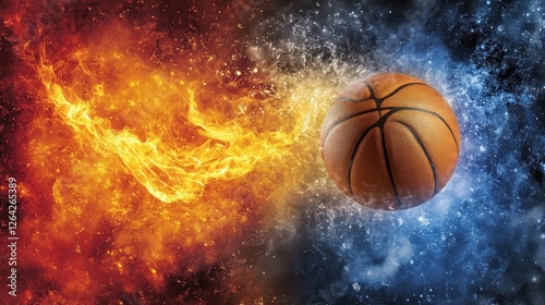A basketball surrounded by fiery flames and icy waves, symbolizing competition and intensity.