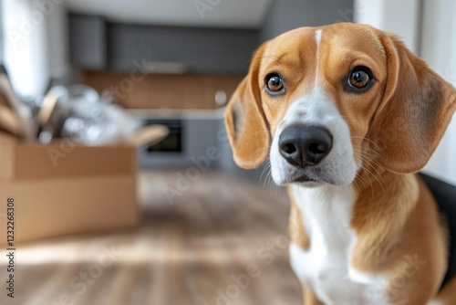 A beagle sits peacefully in an empty cardboard box, showcasing its expressive nature and an atmosphere of contemplation within a beautifully designed living space.