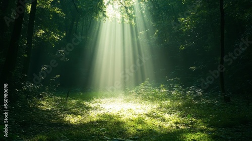 A beam of sunlight filtering through a dense forest, casting soft shadows on the ground.