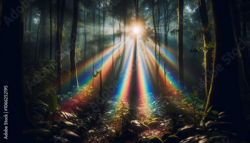 A beam of sunlight piercing through dense forest trees, casting rainbow-like aberrations on leaves and creating a surreal colorful glow over the forest floor.