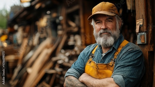 A bearded carpenter stands confidently in front of his rustic workshop, surrounded by piles of wood and tools. He wears a yellow apron and a cap, showcasing a blend of craftsmanship and years of exper