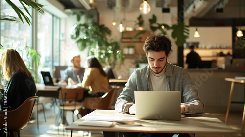 A bearded man focuses on his laptop while working in a modern, cozy coffee shop with warm lighting and a relaxed atmosphere.