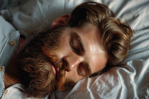 A bearded man lying in bed, deeply asleep and enjoying a calm and restful sleep