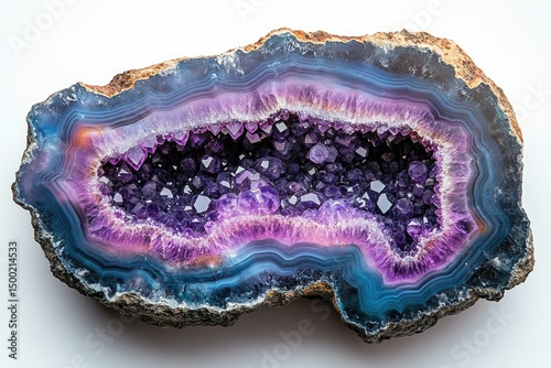 A beautiful amethyst geode showcases a stunning array of purple crystals, surrounded by layers of blue and brown agate.