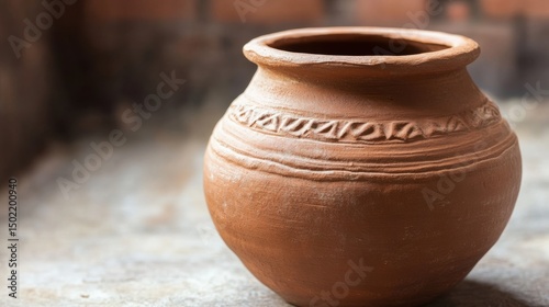 A beautiful, antique earthen pot sitting in a rustic setting. This pot exudes a sense of history, with its traditional design and subtle textures