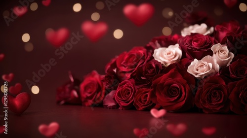 A beautiful arrangement featuring a bouquet of red and white roses, complemented by scattered roses and heart shapes, creating a romantic atmosphere.