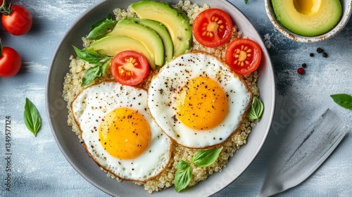 A beautiful arrangement of fried eggs atop a bed of quinoa, garnished with cherry tomatoes and avocado slices, showcasing a healthy and colorful meal.