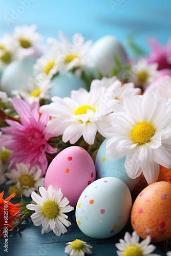 A beautiful background with colorful Easter eggs and blooming spring flowers,
