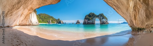 A beautiful beach with a large archway in the background. The archway is surrounded by a rocky cliff and the water is calm. The scene is serene and peaceful, with the archway adding a sense of mystery