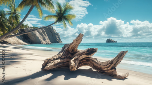 A beautiful beach with white sand and turquoise water. In the foreground, there is an old driftwood log lying on its side on the shore