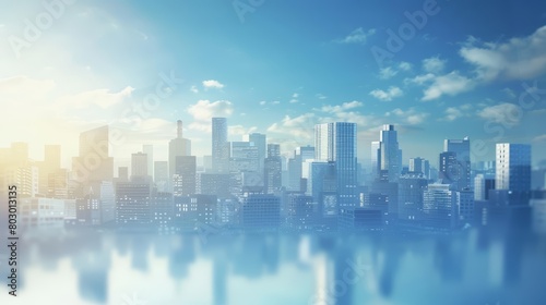 A beautiful cityscape with a blue sky and white clouds. The sun is shining brightly and the city is bustling with activity.