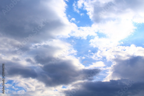 A beautiful cloudy sky, cumulus clouds and scorching sun. Background. Landscape.