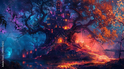 A beautiful colorful gothic fantasy castle built into the side of an ancient tree