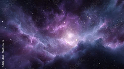 A beautiful cosmic nebula with glowing stars and clouds of purple and blue in the night sky, a deep space abstract illustration.