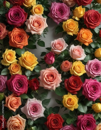 A beautiful display of different colored roses with leaves framing the edges, multiple, contrast, colorful