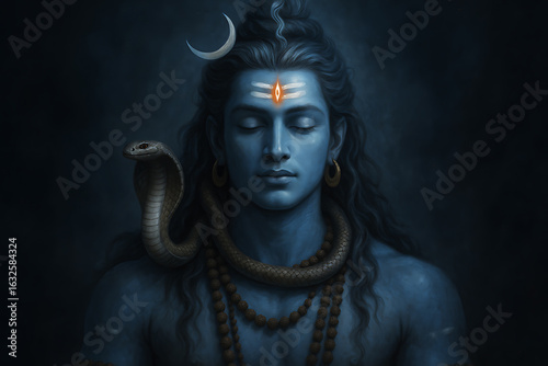 A beautiful divine portrait of lord shiva in deep meditation, with his third eye, crescent moon, and sacred snake, radiating serenity.