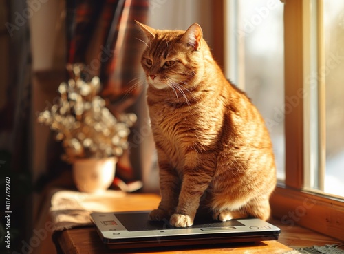 A beautiful fat cat sits on electronic scales. Pet care and diet theme