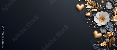 A beautiful floral design with black, gold, heart and leaf elements on black background, minimal combine with art deco 3d illustration