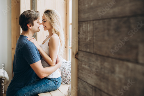 A beautiful girl sits on a window sill and an attractive guy stands next to her, they hug each other and are happy together