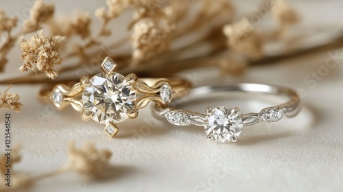 A beautiful gold and diamond ring alongside a silver band on a soft surface with dried floral accents, representing commitment.