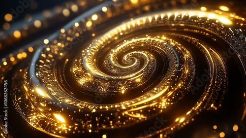 A beautiful golden spiral captivates with its shimmering particles against a dark background, evoking a cosmic ambiance