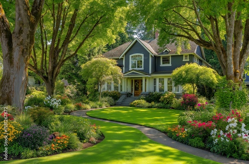 A beautiful home with a lush green lawn and trees, showcasing