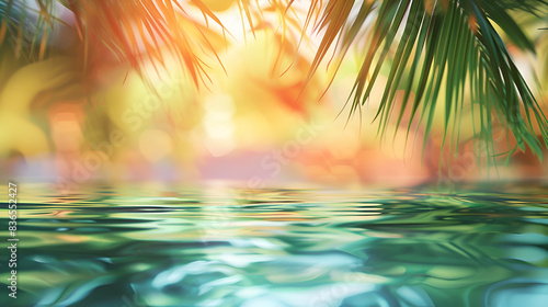 A beautiful image of a palm tree with a body of water in the background. The image has a serene and peaceful mood, evoking feelings of relaxation and tranquility