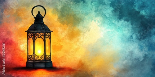 A Beautiful Lantern Glows Against a Vibrant Abstract Background of Golden and Blue Hues
