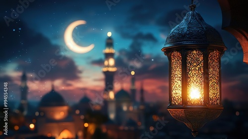 A beautiful lantern illuminates the night sky, with a crescent moon and mosque silhouette in the background, evoking tranquility.