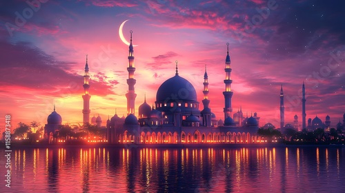 A beautiful mosque silhouette at sunset with a crescent moon reflecting in the water.