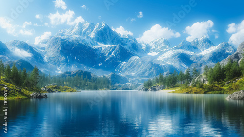 A beautiful mountain range with a lake in the foreground. The sky is clear and blue, and the mountains are covered in snow. The scene is peaceful and serene, with the water reflecting the mountains