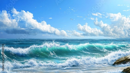 A beautiful ocean scene with crashing waves and a blue sky with fluffy clouds